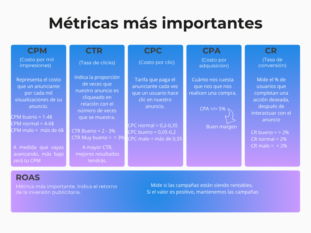 Las métricas son el idioma del Media Buyer. Las métricas más importantes son las siguientes: